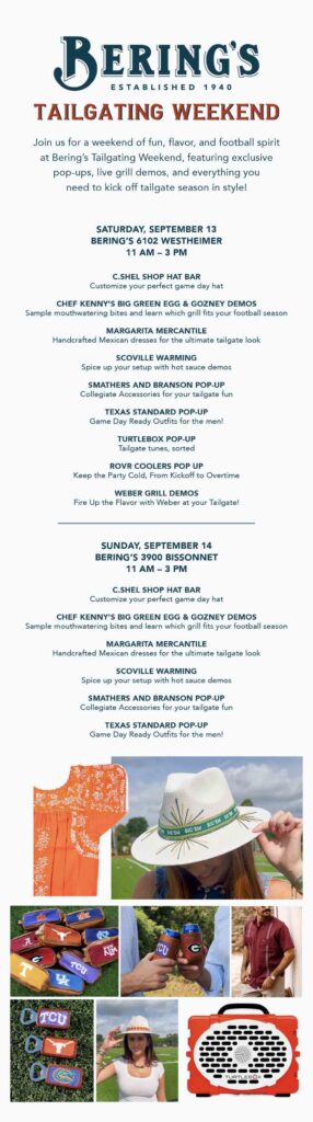 Join us for a weekend of fun, flavor, and football spirit at Bering’s Tailgating Weekend, featuring exclusive pop-ups, live grill demos, and everything you need to kick off tailgate season in style!
