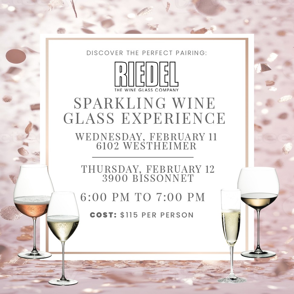 Bering's Events Past Events Riedel Sparkling Wine Glass Experience at Westheimer Riedel Sparkling Wine Glass Experience at Westheimer Wednesday, February 11 6-7PM 6102 Westheimer map Register at https://www.eventbrite.com/e/1980570629067?aff=oddtdtcreator