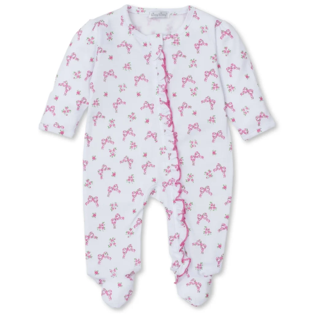 - Adorned with an enchanting bow pattern in a soft pink hue, the footie adds a dash of whimsy to your baby’s attire.